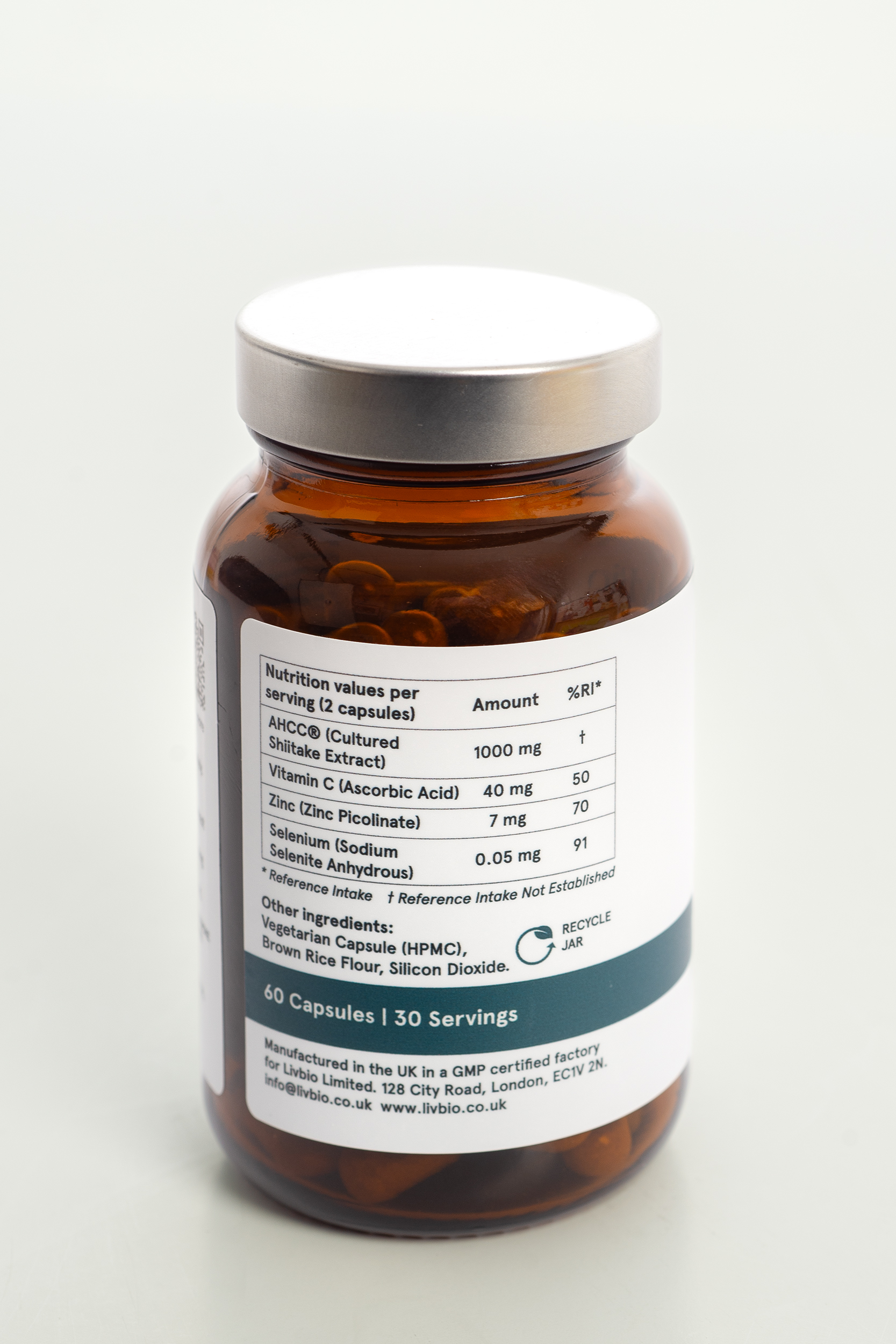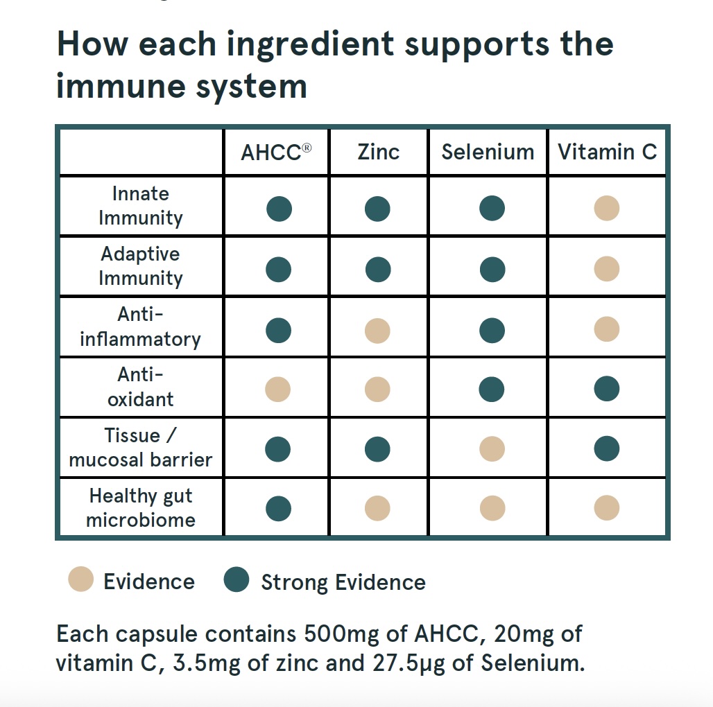 Each capsule contains 500mg of AHCC, 20mg of vitamin C, 3.5mg of zinc and 27.5μg of Selenium